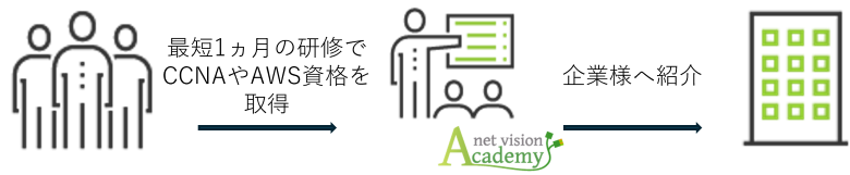 他社平均65時間(※弊社調べ)に対して、1日8時間×20日=合計160時間のスクールを受講。CCNA・AWS資格取得に留まらず、現場で躍できるよう実機演習における報告・連絡・相談の徹底もカリキュラムに組み込んでいます。入校前に面談を行い、コミュニケーション能力・IT素養・職歴などを評価のうえ、基準を上回った人材のみ入校を許可しています。